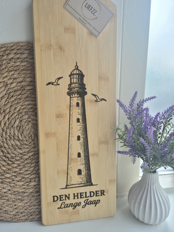 OverzichtBreng een vleugje kustgevoel naar je borreltafel met deze unieke houten borrelplank, gegraveerd met de iconische vuurtoren De Lange Jaap uit Den Helder. Met zijn royale formaat van 60 x 17 cm is deze plank perfect voor een gezellige borrel of tapasavond met vrienden en familie.