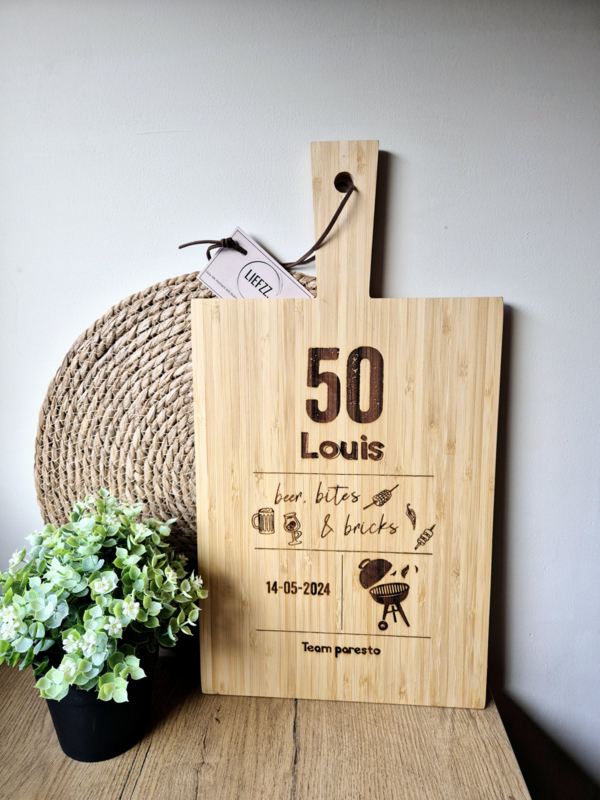 OverzichtMaak elke borrelavond compleet met onze volledig personaliseerbare borrelplank "Beer, Bites en Bricks." Perfect voor het serveren van je favoriete hapjes en drankjes, en een geweldig jubileumscadeau!