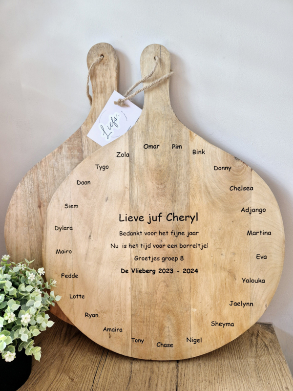 OverzichtDeze borrelplank is perfect als afscheidscadeau voor een juf van groep 8, maar kan ook naar wens gegraveerd worden voor een collega die vertrekt. U kunt ervoor kiezen om geen namen te laten graveren, dan laat u dit veld leeg.