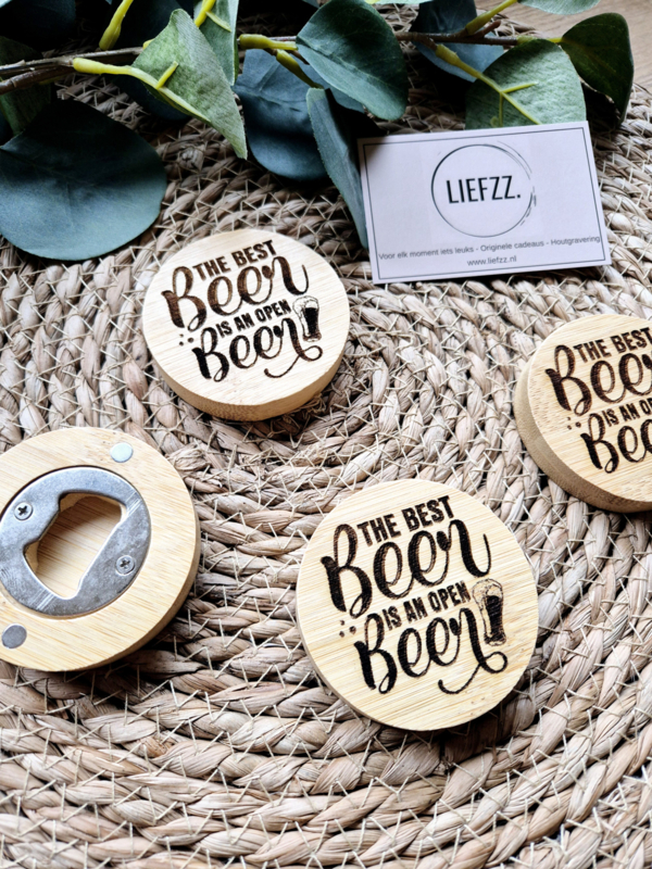 Voeg een speelse touch toe aan je borrelavonden met deze stijlvolle bieropener met magneet en de tekst "Best Beer is an Open Beer". Perfect voor elke bierliefhebber of als een leuk cadeau.