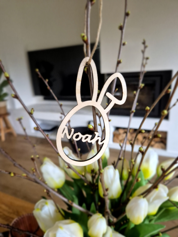 Deze leuke houten hanger staat goed in de paastakken. De tekst wordt gegraveerd, waardoor deze hanger ook goed geschikt is voor namen met puntjes of streepjes.