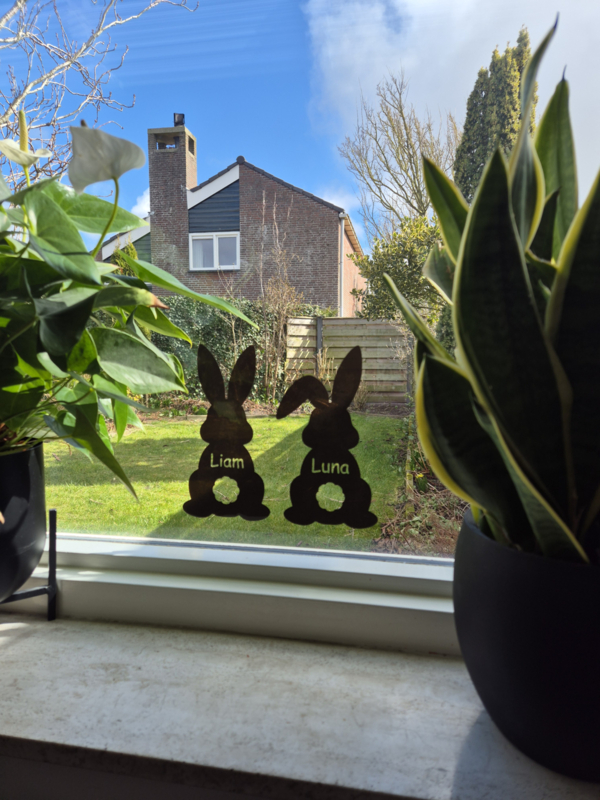 Paashaasje raamsticker met naamMaak je huis helemaal klaar voor Pasen met deze schattige, herbruikbare raamsticker!